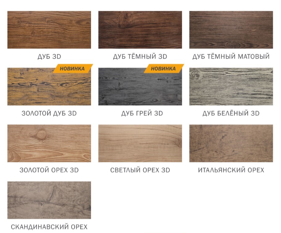 А какие интересные цвета! «Золотой орех 3Д», «Дуб тёмный матовый», «Светлый орех 3Д», «Дуб белёный 3Д».